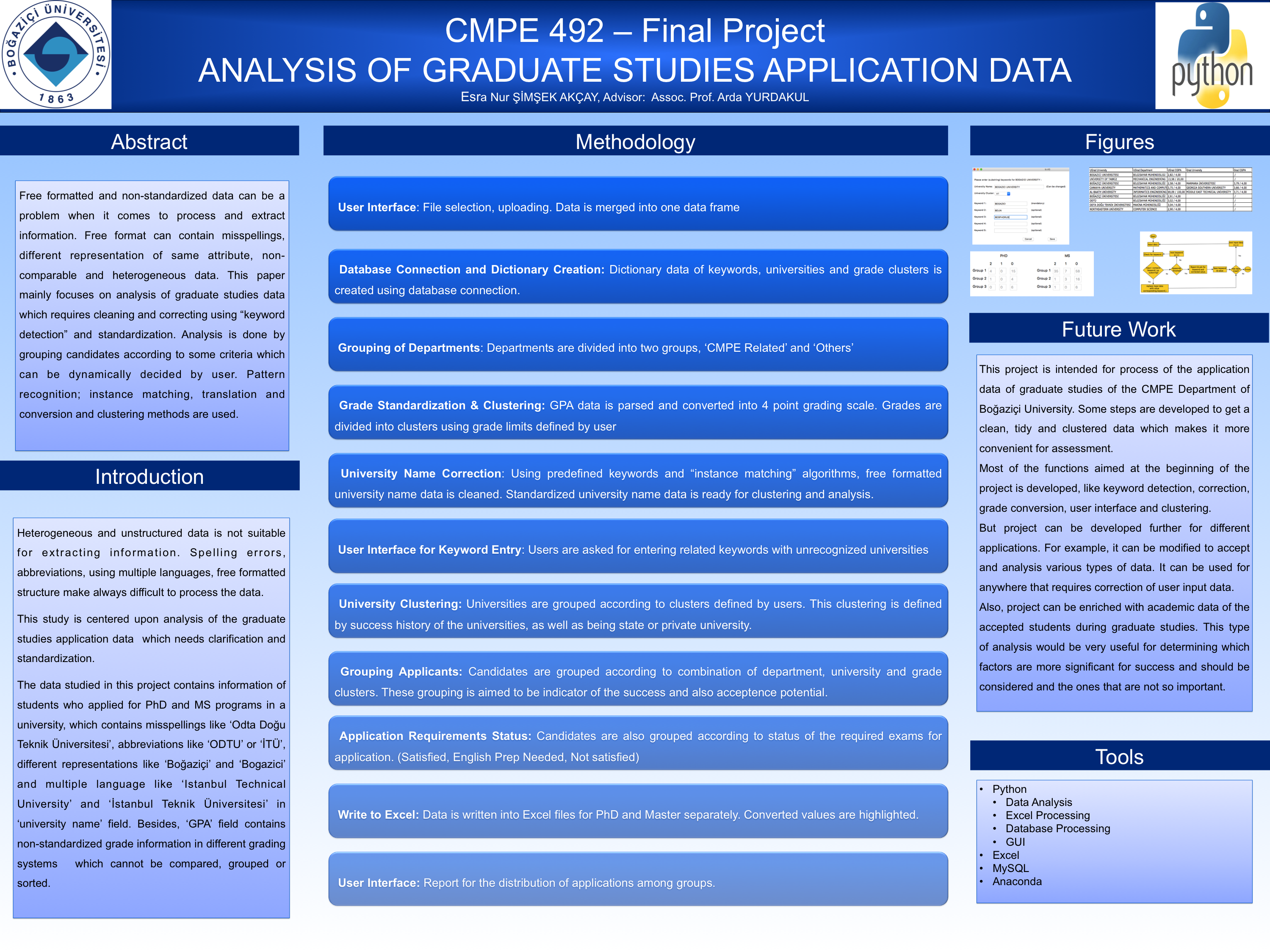 Free formatted and non-standardized data can be a problem when it comes to process and extract information. Free format can contain misspellings, different representation of same attribute, non-comparable and heterogeneous data. This paper mainly focuses on analysis of graduate studies data which requires cleaning and correcting using “keyword detection” and standardization. Analysis is done by grouping candidates according to some criteria which can be dynamically decided by user. Pattern recognition; instance matching, translation and conversion and clustering methods are used.