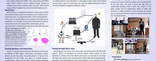 Nao Robot Avatar project is implementation of a system that enables seeing from NAO's eyes and moving with NAO's body. NAO's motions will be copied through utilizing an adapted whole-body tracking system and the robot camera images will be displayed on a head mounted display system. For whole-body tracking system, Kinect device, Robot Operating System and openni tracker are used. To get the vision from NAO's perspective, a 3D recording device is designed by using two webcams and placed on the head of the NAO. For head mount display system, a simple virtual reality box is used and webcam screens are mirrored from computer by using Duet display.