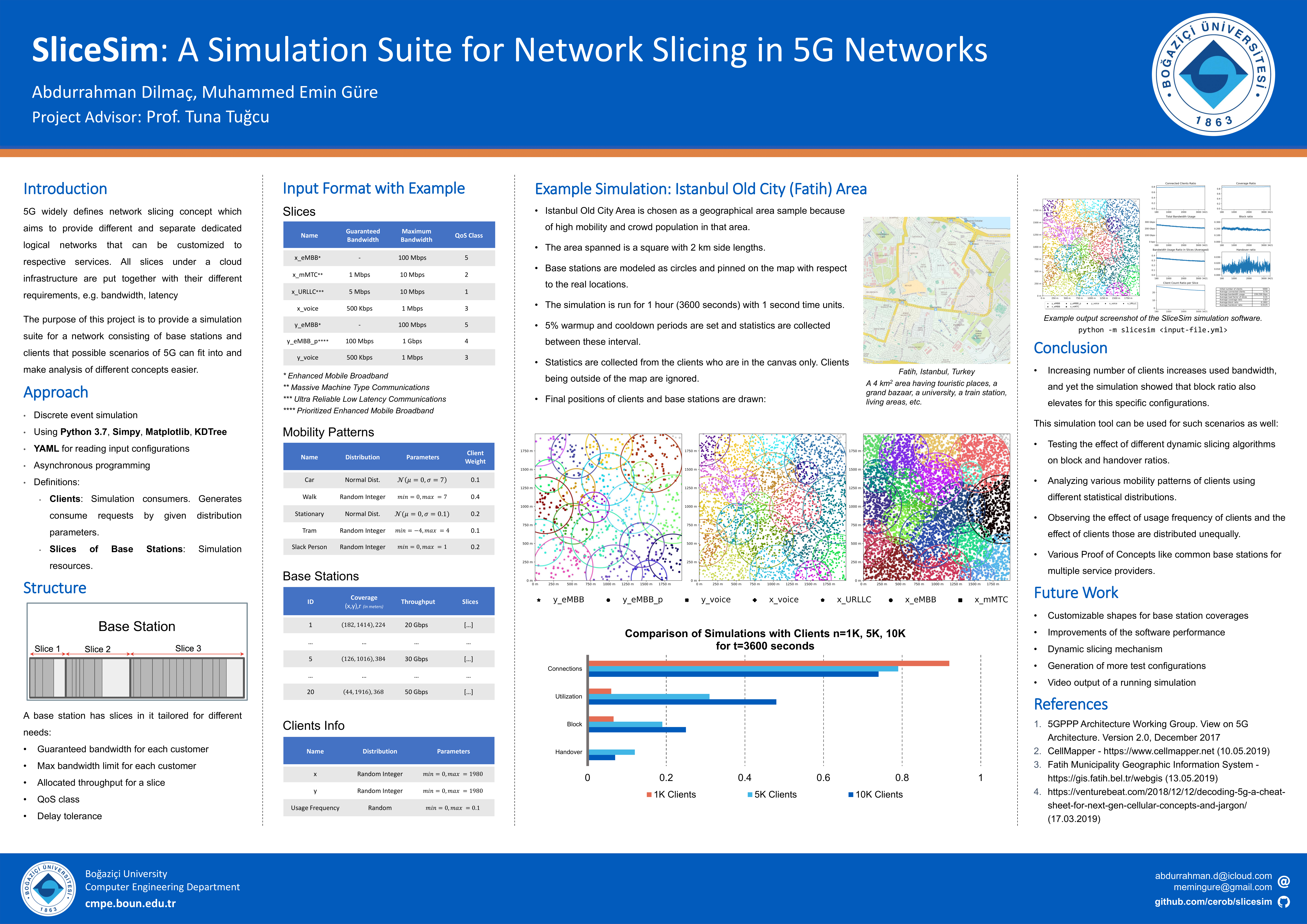 5G widely defines network slicing concept which aims to provide different and separate dedicated logical networks that can be customized to respective services. All slices under a cloud infrastructure are put together with their different requirements, e.g. bandwidth, latency. The purpose of this project is to provide a simulation suite for a network consisting of base stations and clients that possible scenarios of 5G can fit into and make analysis of different concepts easier.